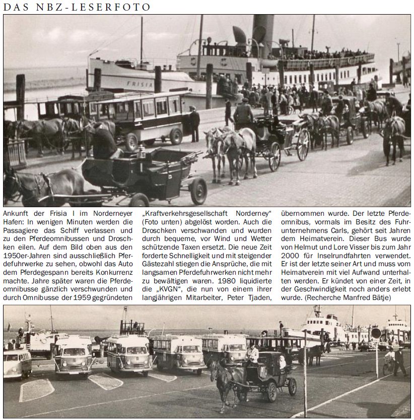 Ankunft der Frisia I im Norderneyer Hafen: In wenigen Minuten werden die Passagiere das Schiff verlassen und zu den Pferdeomnibussen und Droschken eilen. Auf dem Bild oben aus den 1950er-Jahren sind ausschließlich Pferdefuhrwerke zu sehen, obwohl das Auto dem Pferdegespann bereits Konkurrenz machte. Jahre später waren die Pferdeomnibusse gänzlich verschwunden und durch Omnibusse der 1959 gegründeten "Kraftverkehrsgesellschaft Norderney" (Foto unten) abgelöst worden. Auch die Droschken verschwanden und wurden durch bequeme, vor Wind und Wetter schützende Taxen ersetzt. Die neue Zeit forderte Schnelligkeit und mit steigender Gästezahl stiegen die Ansprüche, die mit langsamen Pferdefuhrwerken nicht mehr zu bewältigen waren. 1980 liquidierte die "KVGN", die nun von einem ihrer langjährigen Mitarbeiter, Peter Tjaden, übernommen wurde. Der letzte Pferdeomnibus, vormals im Besitz des Fuhrunternehmens Carls, gehört seit Jahren dem Heimatverein. Dieser Bus wurde von Helmut und Lore Visser bis zum Jahr 2000 für Inselrundfahrten verwendet. Er ist der letzte seiner Art und muss vom Heimatverein mit viel Aufwand unterhalten werden. Er kündet von einer Zeit, in der Geschwindigkeit noch anders erlebt wurde.
