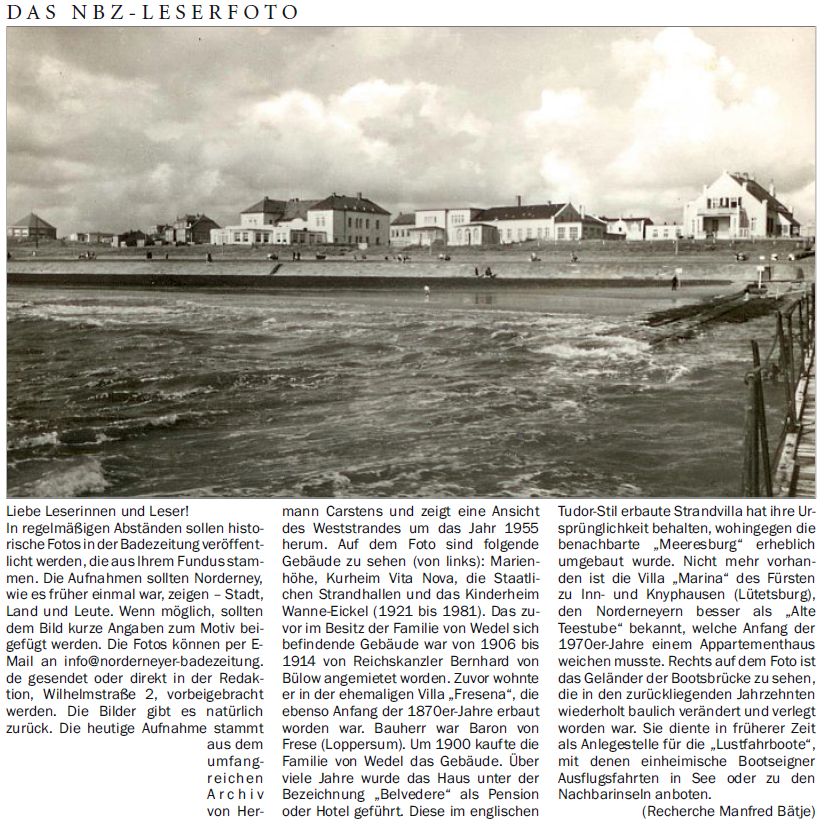 Die heutige Aufnahme stammt aus dem umfangreichen Archiv von Hermann Carstens und zeigt eine Ansicht des Weststrandes um das Jahr 1955 herum. Auf dem Foto sind folgende Gebäude zu sehen (von links): Marienhöhe, Kurheim Vita Nova, die Staatlichen Strandhallen und das Kinderheim Wanne-Eickel (1921 bis 1981). Das zuvor im Besitz der Familie von Wedel sich befindende Gebäude war von 1906 bis 1914 von Reichskanzler Bernhard von Bülow angemietet worden. Zuvor wohnte er in der ehemaligen Villa "Fresena", die ebenso Anfang der 1870er-Jahre erbaut worden war. Bauherr war Baron von Frese (Loppersum). Um 1900 kaufte die Familie von Wedel das Gebäude. Über viele Jahre wurde das Haus unter der Bezeichnung "Belvedere" als Pension oder Hotel geführt. Diese im englischen Tudor-Stil erbaute Strandvilla hat ihre Ursprünglichkeit behalten, wohingegen die benachbarte "Meeresburg" erheblich umgebaut wurde. Nicht mehr vorhanden ist die Villa "Marina" des Fürsten zu Inn- und Knyphausen (Lütetsburg), den Norderneyern besser als "Alte Teestube" bekannt, welche Anfang der 1970er-Jahre einem Appartementhaus weichen musste. Rechts auf dem Foto ist das Geländer der Bootsbrücke zu sehen, die in den zurückliegenden Jahrzehnten wiederholt baulich verändert und verlegt worden war. Sie diente in früherer Zeit als Anlegestelle für die "Lustfahrboote", mit denen einheimische Bootseigner Ausflugsfahrten in See oder zu den Nachbarinseln anboten. (Recherche Manfred Bätje)