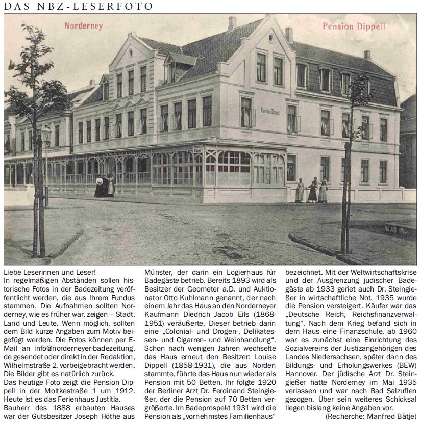 Arzt Dr. Ferdinand Steingießer, der die Pension auf 70 Betten vergrößerte. Im Badeprospekt 1931 wird die Pension als "vornehmstes Familienhaus" bezeichnet. Mit der Weltwirtschaftskrise und der Ausgrenzung jüdischer Badegäste ab 1933 geriet auch Dr. Steingießer in wirtschaftliche Not. 1935 wurde die Pension versteigert. Käufer war das "Deutsche Reich, Reichsfinanzverwaltung". Nach dem Krieg befand sich in dem Haus eine Finanzschule, ab 1960 war es zunächst eine Einrichtung des Sozialvereins der Justizangehörigen des Landes Niedersachsen, später dann des Bildungs- und Erholungswerkes (BEW) Hannover. Der jüdische Arzt Dr. Steingießer hatte Norderney im Mai 1935 verlassen und war nach Bad Salzuflen gezogen. Über sein weiteres Schicksal liegen bislang keine Angaben vor. (Recherche: Manfred Bätje)