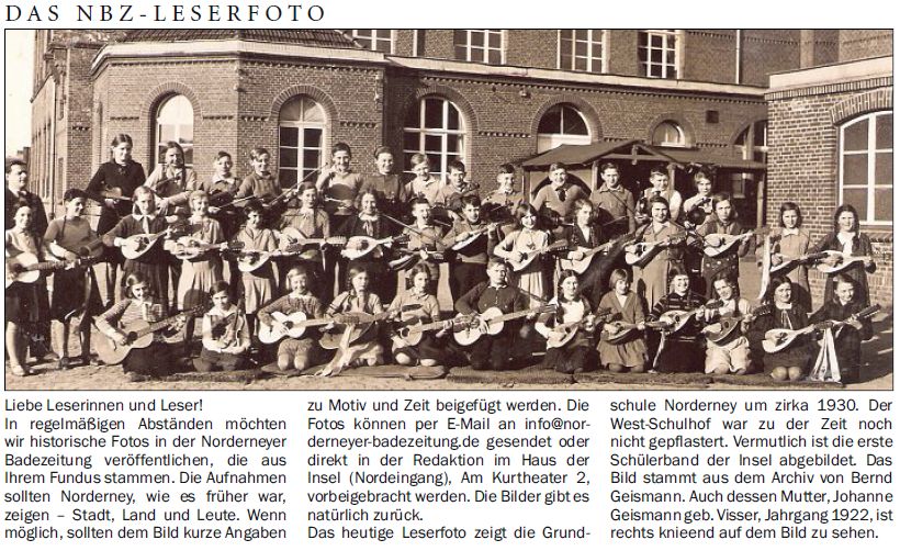 Das heutige Leserfoto zeigt die Grundschule Norderney um zirka 1930. Der West-Schulhof war zu der Zeit noch nicht gepflastert. Vermutlich ist die erste Schülerband der Insel abgebildet. Das Bild stammt aus dem Archiv von Bernd Geismann. Auch dessen Mutter, Johanne Geismann geb. Visser, Jahrgang 1922, ist rechts knieend auf dem Bild zu sehen.