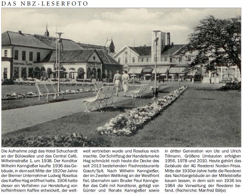 Die Aufnahme zeigt das Hotel Schuchardt an der Bülowallee und das Central Café, Wilhelmstraße 1, um 1938. Der Konditor Wilhelm Kanngießer kaufte 1936 dasGebäude, in dem seit Mitte der 1920er-Jahre der Bremer Unternehmer Ludwig Roselius das Kaffee Hag eröffnet hatte. 1906 hatte dieser ein Verfahren zur Herstellung von koffeinfreiem Kaffee entwickelt, der weltweit vertrieben wurde und Roselius reich machte. Der Schriftzug der Handelsmarke Hag schmückt noch heute die Decke des seit 2013 bestehenden Fischrestaurants Gosch/Sylt. Nach Wilhelm Kanngießer, der im Zweiten Weltkrieg an der Westfront fiel, übernahm sein Bruder Paul Kanngießer das Café mit Konditorei, gefolgt von Günter und Renate Kanngießer sowie in dritter Generation von Ute und Ulrich Tillmann. Größere Umbauten erfolgten 1956, 1978 und 2010. Heute gehört das Gebäude der AG Reederei Norden-Frisia. Mitte der 1930er-Jahre hatte die Reederei das Nachbargebäude an der Mittelstraße bauen lassen, in dem sich von 1936 bis 1984 die Verwaltung der Reederei befand. (Recherche: Manfred Bätje)