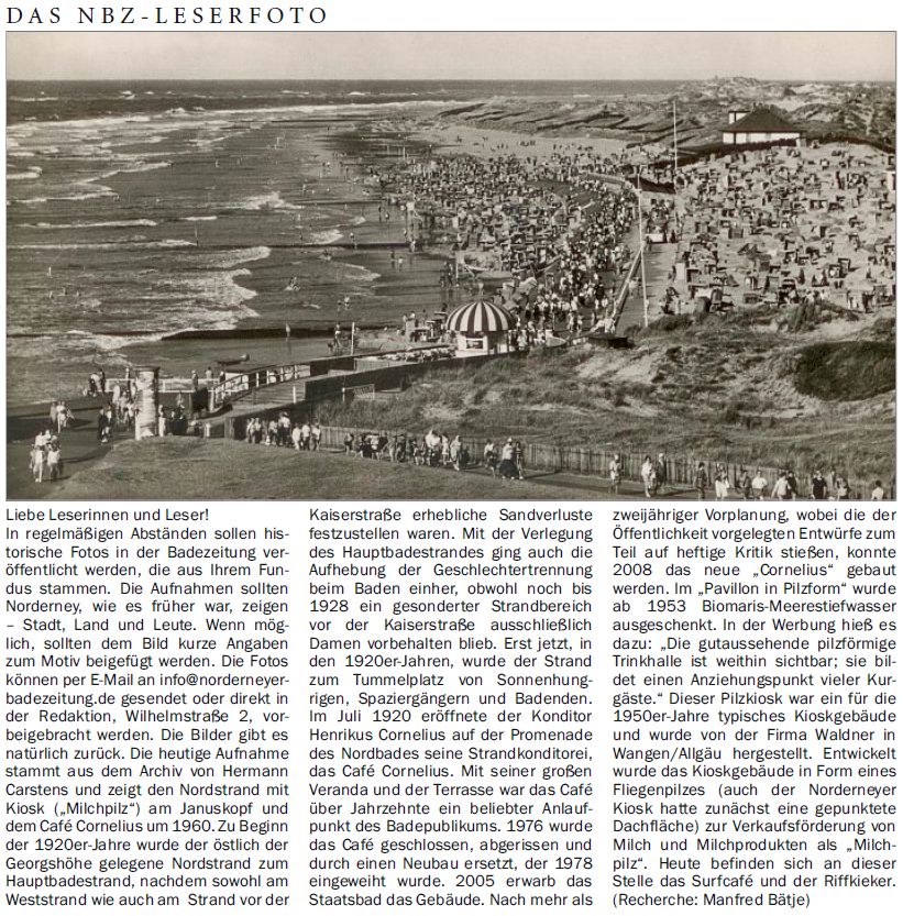Die heutige Aufnahme stammt aus dem Archiv von Hermann Carstens und zeigt den Nordstrand mit Kiosk ("Milchpilz") am Januskopf und dem Café Cornelius um 1960. Zu Beginn der 1920er-Jahre wurde der östlich der Georgshöhe gelegene Nordstrand zum Hauptbadestrand, nachdem sowohl am Weststrand wie auch am Strand vor der Kaiserstraße erhebliche Sandverluste festzustellen waren. Mit der Verlegung des Hauptbadestrandes ging auch die Aufhebung der Geschlechtertrennung beim Baden einher, obwohl noch bis 1928 ein gesonderter Strandbereich vor der Kaiserstraße ausschließlich Damen vorbehalten blieb. Erst jetzt, in den 1920er-Jahren, wurde der Strand zum Tummelplatz von Sonnenhungrigen, Spaziergängern und Badenden. Im Juli 1920 eröffnete der Konditor Henrikus Cornelius auf der Promenade des Nordbades seine Strandkonditorei, das Café Cornelius. Mit seiner großen Veranda und der Terrasse war das Café über Jahrzehnte ein beliebter Anlaufpunkt des Badepublikums. 1976 wurde das Café geschlossen, abgerissen und durch einen Neubau ersetzt, der 1978 eingeweiht wurde. 2005 erwarb das Staatsbad das Gebäude. Nach mehr als zweijähriger Vorplanung, wobei die der Öffentlichkeit vorgelegten Entwürfe zum Teil auf heftige Kritik stießen, konnte 2008 das neue "Cornelius" gebaut werden. Im "Pavillon in Pilzform" wurde ab 1953 Biomaris-Meerestiefwasser ausgeschenkt. In der Werbung hieß es dazu: "Die gutaussehende pilzförmige Trinkhalle ist weithin sichtbar; sie bildet einen Anziehungspunkt vieler Kurgäste." Dieser Pilzkiosk war ein für die 1950er-Jahre typisches Kioskgebäude und wurde von der Firma Waldner in Wangen/Allgäu hergestellt. Entwickelt wurde das Kioskgebäude in Form eines Fliegenpilzes (auch der Norderneyer Kiosk hatte zunächst eine gepunktete Dachfläche) zur Verkaufsförderung von Milch und Milchprodukten als "Milchpilz". Heute befinden sich an dieser Stelle das Surfcafé und der Riffkieker. (Recherche: Manfred Bätje)