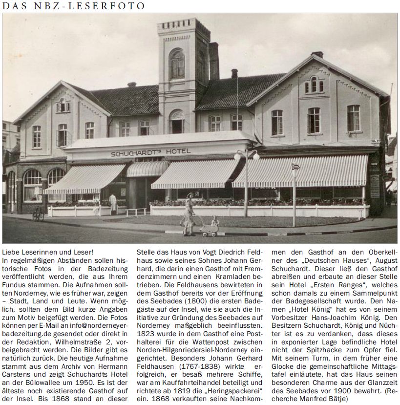 Die heutige Aufnahme stammt aus dem Archiv von Hermann Carstens und zeigt Schuchardts Hotel an der Bülowallee um 1950. Es ist der älteste noch existierende Gasthof auf der Insel. Bis 1868 stand an dieser Stelle das Haus von Vogt Diedrich Feldhaus sowie seines Sohnes Johann Gerhard, die darin einen Gasthof mit Fremdenzimmern und einen Kramladen betrieben. Die Feldhausens bewirteten in dem Gasthof bereits vor der Eröffnung des Seebades (1800) die ersten Badegäste auf der Insel, wie sie auch die Initiative zur Gründung des Seebades auf Norderney maßgeblich beeinflussten. 1823 wurde in dem Gasthof eine Posthalterei für die Wattenpost zwischen Norden Hilgenriedersiel-Norderney eingerichtet. Besonders Johann Gerhard Feldhausen (1767-1838) wirkte erfolgreich, er besaß mehrere Schiffe, war am Kauffahrteihandel beteiligt und richtete ab 1819 die "Heringspackerei" ein. 1868 verkauften seine Nachkommen den Gasthof an den Oberkellner des "Deutschen Hauses", August Schuchardt. Dieser ließ den Gasthof abreißen und erbaute an dieser Stelle sein Hotel "Ersten Ranges", welches schon damals zu einem Sammelpunkt der Badegesellschaft wurde. Den Namen "Hotel König" hat es von seinem Vorbesitzer Hans Joachim König. Den Besitzern Schuchardt, König und Nüchter ist es zu verdanken, dass dieses in exponierter Lage befindliche Hotel nicht der Spitzhacke zum Opfer fiel. Mit seinem Turm, in dem früher eine Glocke die gemeinschaftliche Mittagstafel einläutete, hat das Haus seinen besonderen Charme aus der Glanzzeit des Seebades vor 1900 bewahrt. (Recherche Manfred Bätje).