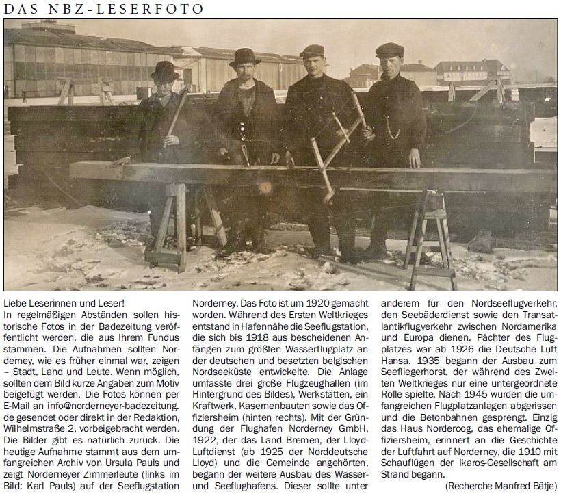 Die heutige Aufnahme stammt aus dem umfangreichen Archiv von Ursula Pauls und zeigt Norderneyer Zimmerleute (links im Bild: Karl Pauls) auf der Seeflugstation Norderney. Das Foto istum1920 gemacht worden. Während des Ersten Weltkrieges entstand in Hafennähe die Seeflugstation, die sich bis 1918 aus bescheidenen Anfängen zum größten Wasserflugplatz an der deutschen und besetzten belgischen Nordseeküste entwickelte. Die Anlage umfasste drei große Flugzeughallen (im Hintergrund des Bildes), Werkstätten, ein Kraftwerk, Kasernenbauten sowie das Offiziersheim (hinten rechts). Mit der Gründung der Flughafen Norderney GmbH, 1922, der das Land Bremen, der Lloyd-Luftdienst (ab 1925 der Norddeutsche Lloyd) und die Gemeinde angehörten, begann der weitere Ausbau des Wasserund Seeflughafens. Dieser sollte unter anderem für den Nordseeflugverkehr, den Seebäderdienst sowie den Transatlantikflugverkehr zwischen Nordamerika und Europa dienen. Pächter des Flugplatzes war ab 1926 die Deutsche Luft Hansa. 1935 begann der Ausbau zum Seefliegerhorst, der während des Zweiten Weltkrieges nur eine untergeordnete Rolle spielte. Nach 1945 wurden die umfangreichen Flugplatzanlagen abgerissen und die Betonbahnen gesprengt. Einzig das Haus Norderoog, das ehemalige Offiziersheim, erinnert an die Geschichte der Luftfahrt auf Norderney, die 1910 mit Schauflügen der Ikaros-Gesellschaft am Strand begann. (Recherche Manfred Bätje)
