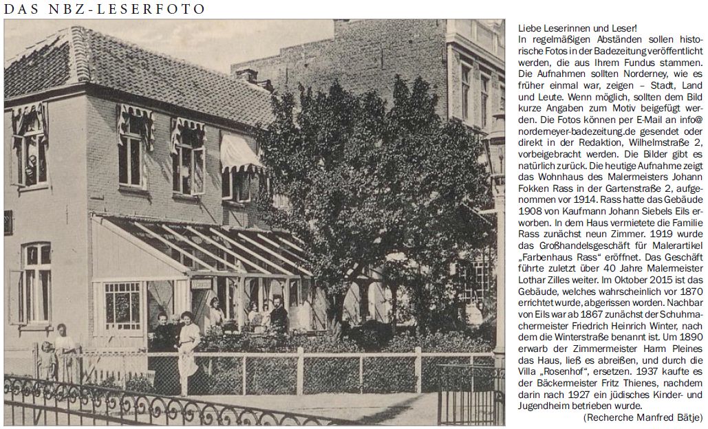 Die heutige Aufnahme zeigt das Wohnhaus des Malermeisters Johann Fokken Rass in der Gartenstraße 2, aufgenommen vor 1914. Rass hatte das Gebäude 1908 von Kaufmann Johann Siebels Eils erworben. In dem Haus vermietete die Familie Rass zunächst neun Zimmer. 1919 wurde das Großhandelsgeschäft für Malerartikel "Farbenhaus Rass" eröffnet. Das Geschäft führte zuletzt über 40 Jahre Malermeister Lothar Zilles weiter. Im Oktober 2015 ist das Gebäude, welches wahrscheinlich vor 1870 errichtet wurde, abgerissen worden. Nachbar von Eils war ab 1867 zunächst der Schuhmachermeister Friedrich Heinrich Winter, nach dem die Winterstraße benannt ist. Um 1890 erwarb der Zimmermeister Harm Pleines das Haus, ließ es abreißen, und durch die Villa "Rosenhof", ersetzen. 1937 kaufte es der Bäckermeister Fritz Thienes, nachdem darin nach 1927 ein jüdisches Kinder- und Jugendheim betrieben wurde. (Recherche Manfred Bätje)