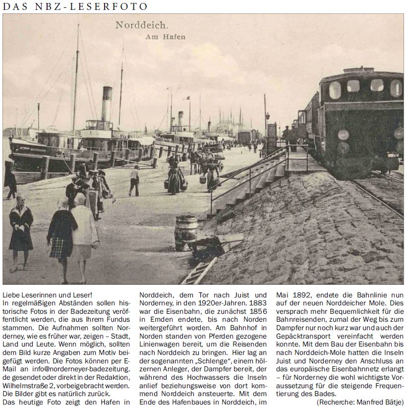Das heutige Foto zeigt den Hafen in Norddeich, dem Tor nach Juist und Norderney, in den 1920er-Jahren. 1883 war die Eisenbahn, die zunächst 1856 in Emden endete, bis nach Norden weitergeführt worden. Am Bahnhof in Norden standen von Pferden gezogene Linienwagen bereit, um die Reisenden nach Norddeich zu bringen. Hier lag an der sogenannten "Schlenge", einem hölzernen Anleger, der Dampfer bereit, der während des Hochwassers die Inseln anlief beziehungsweise von dort kommend Norddeich ansteuerte. Mit dem Ende des Hafenbaues in Norddeich, im Mai 1892, endete die Bahnlinie nun auf der neuen Norddeicher Mole. Dies versprach mehr Bequemlichkeit für die Bahnreisenden, zumal der Weg bis zum Dampfer nur noch kurz war und auch der Gepäcktransport vereinfacht werden konnte. Mit dem Bau der Eisenbahn bis nach Norddeich-Mole hatten die Inseln Juist und Norderney den Anschluss an das europäische Eisenbahnnetz erlangt - für Norderney die wohl wichtigste Voraussetzung für die steigende Frequentierung des Bades. (Recherche: Manfred Bätje)