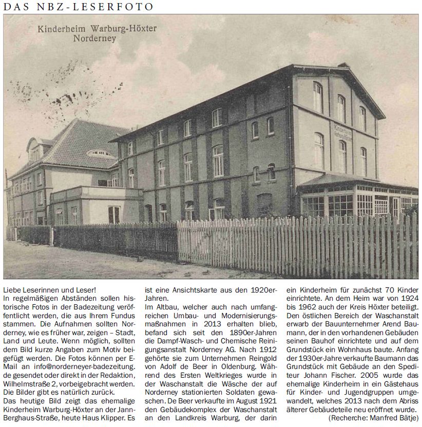 Das heutige Bild zeigt das ehemalige Kinderheim Warburg-Höxter an der Jann-Berghaus-Straße, heute Haus Klipper. Es ist eine Ansichtskarte aus den 1920er-Jahren. Im Altbau, welcher auch nach umfangreichen Umbau- und Modernisierungsmaßnahmen in 2013 erhalten blieb, befand sich seit den 1890er-Jahren die Dampf-Wasch- und Chemische Reinigungsanstalt Norderney AG. Nach 1912 gehörte sie zum Unternehmen Reingold von Adolf de Beer in Oldenburg. Während des Ersten Weltkrieges wurde in der Waschanstalt die Wäsche der auf Norderney stationierten Soldaten gewaschen. De Beer verkaufte im August 1921 den Gebäudekomplex der Waschanstalt an den Landkreis Warburg, der darin ein Kinderheim für zunächst 70 Kinder einrichtete. An dem Heim war von 1924 bis 1962 auch der Kreis Höxter beteiligt. Den östlichen Bereich der Waschanstalt erwarb der Bauunternehmer Arend Baumann, der in den vorhandenen Gebäuden seinen Bauhof einrichtete und auf dem Grundstück ein Wohnhaus baute. Anfang der 1930er-Jahre verkaufte Baumann das Grundstück mit Gebäude an den Spediteur Johann Fischer. 2005 wurde das ehemalige Kinderheim in ein Gästehaus für Kinder- und Jugendgruppen umgewandelt, welches 2013 nach dem Abriss älterer Gebäudeteile neu eröffnet wurde. (Recherche: Manfred Bätje)