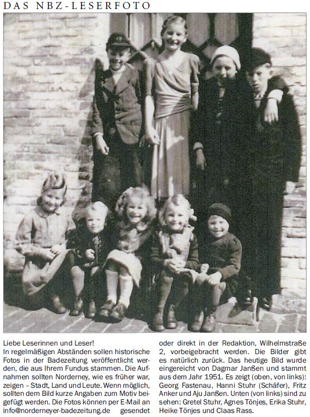 Das heutige Bild wurde eingereicht von Dagmar Janßen und stammt aus dem Jahr 1951. Es zeigt (oben, von links): Georg Fastenau, Hanni Stuhr (Schäfer), Fritz Anker und Aju Janßen. Unten (von links) sind zu sehen: Gretel Stuhr, Agnes Tönjes, Erika Stuhr, Heike Tönjes und Claas Rass.