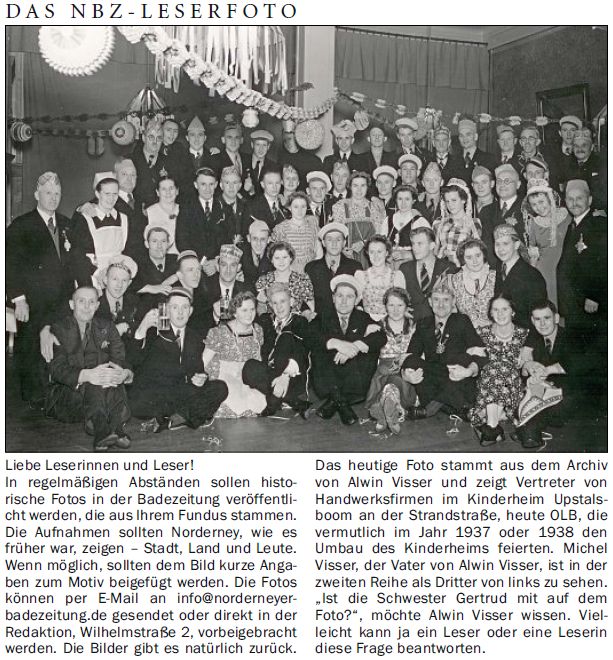 Das heutige Foto stammt aus dem Archiv von Alwin Visser und zeigt Vertreter von Handwerksfirmen im Kinderheim Upstalsboom an der Strandstraße, heute OLB, die vermutlich im Jahr 1937 oder 1938 den Umbau des Kinderheims feierten. Michel Visser, der Vater von Alwin Visser, ist in der zweiten Reihe
