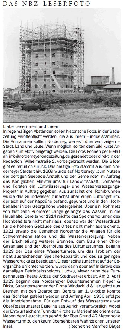 Das heutige Foto stammt aus dem Norderneyer Stadtarchiv. 1889 wurde auf Norderney "zum Nutzen der dortigen Seebade-Anstalt und der Gemeinde" im Auftrag des Königlichen Ministeriums für Landwirtschaft, Domänen und Forsten ein "Entwässerungs- und Wasserversorgungs- Projekt" in Auftrag gegeben. Aus zunächst drei Rohrbrunnen wurde das Grundwasser zunächst über einen Lüftungsturm, der sich auf der Kapdüne befand, gepumpt und in den Hochbehälter in der Georgshöhe weitergeleitet. Über ein Rohrnetz von fast zehn Kilometer Länge gelangte das Wasser in die Haushalte. Bereits vor 1914 reichte das Speichervolumen des Hochbehälters nicht mehr aus, ebenso war der Wasserdruck für die höheren Gebäude des Ortes nicht mehr ausreichend. 1921 erwarb die Gemeinde Norderney die Anlagen für die Schwemmkanalisation und die Wasserversorgung. Neben der Erschließung weiterer Brunnen, dem Bau einer Chlor-Gasanlage und der Überholung des Lüftungsturmes, begann 1929 der Bau eines Wasserturmes, um das Problem der nicht ausreichenden Speicherkapazität und des zu geringen Wasserdrucks zu beseitigen. Dieser sollte zunächst auf der Georgshöhe errichtet werden, wurde dann aber auf Initiative des damaligen Betriebsinspektors Ludwig Meyer nahe des Pumpenhauses (heute Altbau der Stadtwerke) erbaut. Am 3. April 1929 begann das Norderneyer Bauunternehmen Pieper & Dirks, Subunternehmer der Firma Windschild & Langelott aus Bremen, mit den Erdarbeiten. Bereits am 1. Oktober konnte das Richtfest gefeiert werden und Anfang April 1930 erfolgte die Inbetriebnahme. Für den Entwurf des Wasserturms war Ober-Regierungsrat Eggeling aus Aurich verantwortlich, wobei der Entwurf sich am Turm der Kirche zu Marienhafe orientierte. Neben dem Leuchtturmgehört der über Grund 42 Meter hohe Wasserturm zu den kaum übersehbaren Wahrzeichen unserer Insel. (Recherche Manfred Bätje)