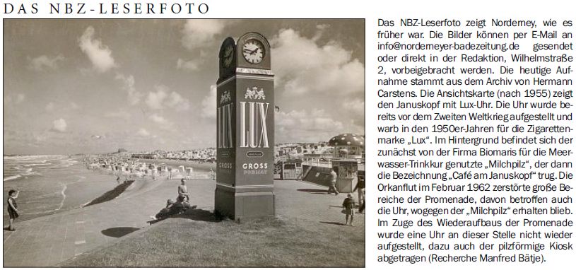 Die heutige Aufnahme stammt aus dem Archiv von Hermann Carstens. Die Ansichtskarte (nach 1955) zeigt den Januskopf mit Lux-Uhr. Die Uhr wurde bereits vor dem Zweiten Weltkrieg aufgestellt und warb in den 1950er-Jahren für die Zigarettenmarke "Lux". Im Hintergrund befindet sich der zunächst von der Firma Biomaris für die Meerwasser-Trinkkur genutzte "Milchpilz", der dann die Bezeichnung "Café am Januskopf" trug. Die Orkanflut im Februar 1962 zerstörte große Bereiche der Promenade, davon betroffen auch die Uhr, wo gegen der "Milchpilz" erhalten blieb. Im Zuge des Wiederaufbaus der Promenade wurde eine Uhr an dieser Stelle nicht wieder aufgestellt, dazu auch der pilzförmige Kiosk abgetragen. (Recherche Manfred Bätje).
