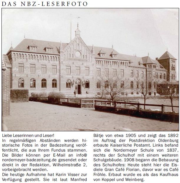 Die heutige Aufnahme hat Karin Visser zur Verfügung gestellt. Sie ist laut Manfred Bätje von etwa 1905 und zeigt das 1892 im Auftrag der Postdirektion Oldenburg erbaute Kaiserliche Postamt. Links befand sich die Norderneyer Schule von 1837, rechts der Schulhof mit einem weiteren Schulgebäude. 1908 begann die Bebauung des Schulhofes: Heute steht hier die Eisdiele Gran Café Florian, davor war es Café Fröhle. Erbaut wurde es als das Kaufhaus von Koppel und Weinberg.