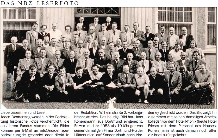 Das heutige Bild hat Hans Konersmann aus Dortmund eingereicht. Er war im Jahr 1953 als 19-Jähriger von seiner damaligen Firma Dortmund-Hörder Hüttenunion auf Sonderurlaub nach Norderney geschickt worden. Das Bild zeigt ihn zusammen mit seinen damaligen Arbeitskollegen vor dem Hotel Phönix (heute Hotel Friese) mit dem Personal des Hauses. Konersmann ist auch danach noch öfter zur Insel zurückgekehrt.