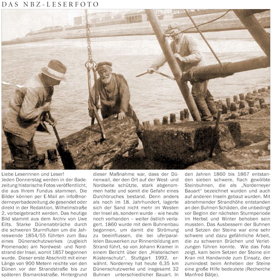Das heutige Bild stammt aus dem Archiv von Uwe Eilts. Starke Dünenabbrüche durch die schweren Sturmfluten um die Jahreswende 1854/55 führten zum Bau eines Dünenschutzwerkes (zugleich Promenade) am Nordwest- und Nordstrand der Insel, womit 1857 begonnen wurde. Dieser erste Abschnitt mit einer Länge von 900 Metern reichte von den Dünen vor der Strandstraße bis zur späteren Bismarckstraße. Hintergrund dieser Maßnahme war, dass der Dünenwall, der den Ort auf der West- und Nordseite schützte, stark abgenommen hatte und somit die Gefahr eines Durchbruches bestand. Denn anders als noch im 18. Jahrhundert, lagerte sich der Sand nicht mehr im Westen der Insel ab, sondern wurde - wie heute noch vorhanden - weiter östlich verlagert. 1860 wurde mit dem Buhnenbau begonnen, um damit die Strömung zu beeinflussen, die bei uferparallelen Bauwerken zur Rinnenbildung am Strand führt, so von Johann Kramer in einem Bericht über den "Historischen Küstenschutz", Stuttgart 1992, erwähnt. Norderney hat heute 6,35 km Dünenschutzwerke und insgesamt 32 Buhnen unterschiedlicher Bauart. In den Jahren 1860 bis 1867 entstanden sieben schwere, flach gewölbte Steinbuhnen, die als "Norderneyer Bauart" bezeichnet wurden und auch auf anderen Inseln gebaut wurden. Mit abnehmender Strandhöhe entstanden an den Buhnen Schäden, die unbedingt vor Beginn der nächsten Sturmperiode im Herbst und Winter behoben sein mussten. Das Ausbessern der Buhnen und Setzen der Steine war eine sehr schwere und dazu gefährliche Arbeit, die zu schweren Brüchen und Verletzungen führen konnte. Wie das Foto zeigt, kam beim Setzen der Steine ein Kran mit Handwinde zum Einsatz, der zumindest beim Anheben der Steine eine große Hilfe bedeutete (Recherche Manfred Bätje).
