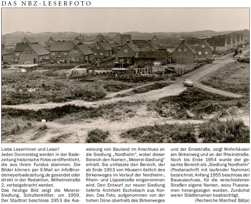 Das heutige Bild zeigt die Meierei-Siedlung, Schultenkötter, um 1959. Der Stadtrat beschloss 1953 die Ausweisung von Bauland im Anschluss an die Siedlung "Nordhelm", wobei dieser Bereich den Namen "Meierei-Siedlung" erhielt. Sie umfasste den Bereich, der ab Ende 1953 von Häusern östlich des Birkenweges im Verlauf der Nordhelm-, Rhein- und Lippestraße eingenommen wird. Den Entwurf zur neuen Siedlung lieferte Architekt Eschebach aus Norden. Das Foto, aufgenommen von der hohen Düne oberhalb des Birkenweges und der Emsstraße, zeigt Wohnhäuser am Birkenweg und an der Rheinstraße. Noch bis Ende 1954 wurde der gesamte Bereich als "Siedlung Nordhelm" (Postanschrift mit laufender Nummer) bezeichnet. Anfang 1955 beschloss der Bauausschuss, für die verschiedenen Straßen eigene Namen, wozu Flussnamen herangezogen wurden. Zunächst waren Städtenamen beabsichtigt. (Recherche Manfred Bätje)