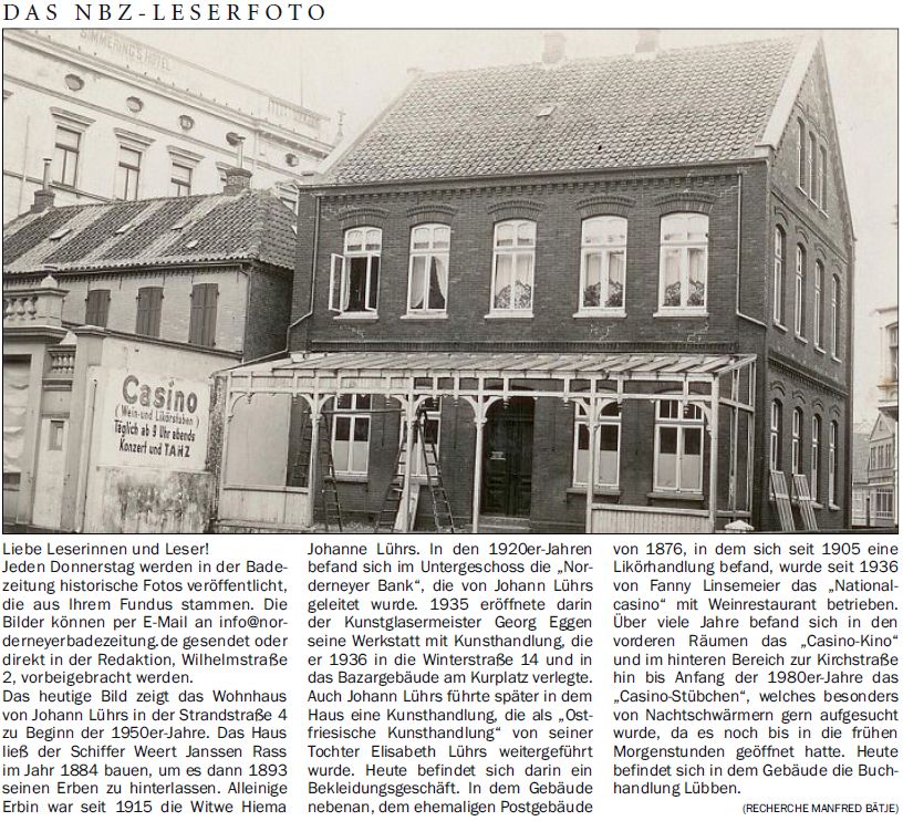Das heutige Bild zeigt das Wohnhaus von Johann Lührs in der Strandstraße 4 zu Beginn der 1950er-Jahre. Das Haus ließ der Schiffer Weert Janssen Rass im Jahr 1884 bauen, um es dann 1893 seinen Erben zu hinterlassen. Alleinige Erbin war seit 1915 die Witwe Hiema Johanne Lührs. In den 1920er-Jahren befand sich im Untergeschoss die "Norderneyer Bank", die von Johann Lührs geleitet wurde. 1935 eröffnete darin der Kunstglasermeister Georg Eggen seine Werkstatt mit Kunsthandlung, die er 1936 in die Winterstraße 14 und in das Bazargebäude am Kurplatz verlegte. Auch Johann Lührs führte später in dem Haus eine Kunsthandlung, die als "Ostfriesische Kunsthandlung" von seiner Tochter Elisabeth Lührs weitergeführt wurde. Heute befindet sich darin ein Bekleidungsgeschäft. In dem Gebäude nebenan, dem ehemaligen Postgebäude von 1876, in dem sich seit 1905 eine Likörhandlung befand, wurde seit 1936 von Fanny Linsemeier das "Nationalcasino" mit Weinrestaurant betrieben. Über viele Jahre befand sich in den vorderen Räumen das "Casino-Kino" und im hinteren Bereich zur Kirchstraße hin bis Anfang der 1980er Jahre das "Casino-Stübchen", welches besonders von Nachtschwärmern gern aufgesucht wurde, da es noch bis in die frühen Morgenstunden geöffnet hatte. Heute befindet sich in dem Gebäude die Buchhandlung Lübben. (Recherche Manfred Bätje)