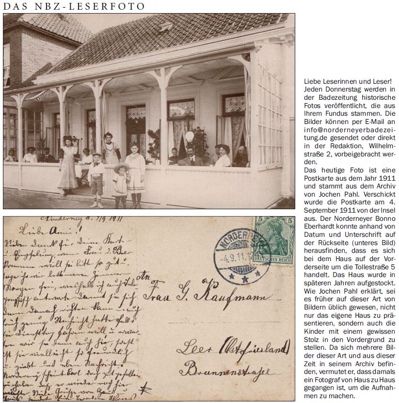 von Jochen Pahl. Verschickt wurde die Postkarte am 4. September 1911 vonder Insel aus. Der Norderneyer Bonno Eberhardt konnte anhand von Datum und Unterschrift auf der Rückseite (unteres Bild) herausfinden, dass es sich bei dem Haus auf der Vorderseite um die Tollestraße 5 handelt. Das Haus wurde in späteren Jahren aufgestockt. Wie Jochen Pahl erklärt, sei es früher auf dieser Art von Bildern üblich gewesen, nicht nur das eigene Haus zu präsentieren, sondern auch die Kinder mit einem gewissen Stolz in den Vordergrund zu stellen. Da sich mehrere Bilder dieser Art und aus dieser Zeit in seinem Archiv befinden, vermutet er, dass damals ein Fotograf von Haus zu Haus gegangen ist, um die Aufnahmen zu machen.