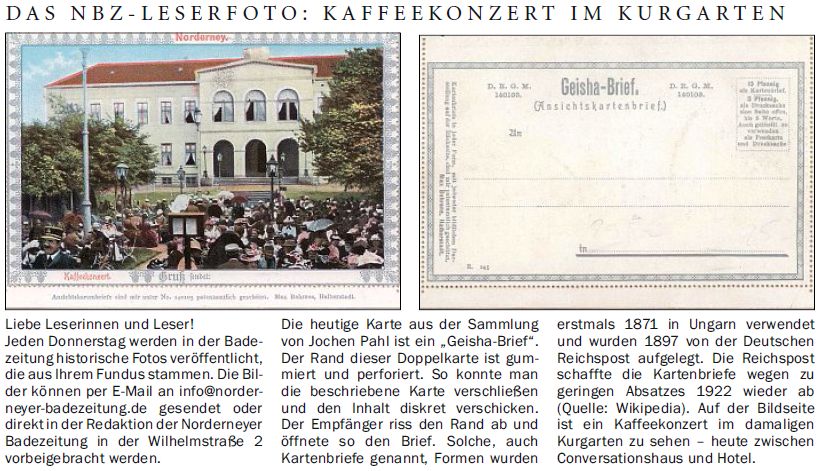 Die heutige Karte aus der Sammlung von Jochen Pahl ist ein "Geisha-Brief". Der Rand dieser Doppelkarte ist gummiert und perforiert. So konnte man die beschriebene Karte verschließen und den Inhalt diskret verschicken. Der Empfänger riss den Rand ab und öffnete so den Brief. Solche, auch Kartenbriefe genannt, Formen wurden erstmals 1871 in Ungarn verwendet und wurden 1897 von der Deutschen Reichspost aufgelegt. Die Reichspost schaffte die Kartenbriefe wegen zu geringen Absatzes 1922 wieder ab (Quelle: Wikipedia). Auf der Bildseite ist ein Kaffeekonzert im damaligen Kurgarten zu sehen - heute zwischen Conversationshaus und Hotel.