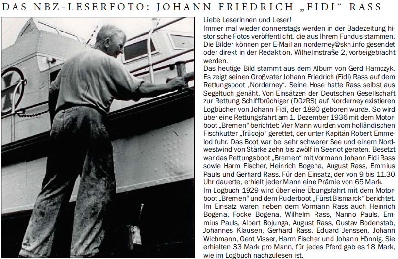 Das heutige Bild stammt aus dem Album von Gerd Hamczyk. Es zeigt seinen Großvater Johann Friedrich (Fidi) Rass auf dem Rettungsboot "Norderney". Seine Hose hatte Rass selbst aus Segeltuch genäht. Von Einsätzen der Deutschen Gesellschaft zur Rettung Schiffbrüchiger (DGzRS) auf Norderney existieren Logbücher von Johann Fidi, der 1890 geboren wurde. So wird über eine Rettungsfahrt am 1. Dezember 1936 mit dem Motorboot "Bremen" berichtet: Vier Mann wurden vom holländischen Fischkutter "Trücojo" gerettet, der unter Kapitän Robert Emmelod fuhr. Das Boot war bei sehr schwerer See und einem Nordwestwind von Stärke zehn bis zwölf in Seenotgeraten. Besetzt war das Rettungsboot "Bremen" mit Vormann Johann Fidi Rass sowie Harm Fischer, Heinrich Bogena, August Rass, Emmius Pauls und Gerhard Rass. Für den Einsatz, der von 9 bis 11.30 Uhr dauerte, erhielt jeder Mann eine Prämie von 65 Mark. Im Logbuch 1929 wird über eine Übungsfahrt mit dem Motorboot "Bremen" und dem Ruderboot "Fürst Bismarck" berichtet. Im Einsatz waren neben dem Vormann Rass auch Heinrich Bogena, Focke Bogena, Wilhelm Rass, Nanno Pauls, Emmius Pauls, Albert Bojunga, August Rass, Gustav Bodenstab, Johannes Klausen, Gerhard Rass, Eduard Jenssen, Johann Wichmann, Gent Visser, Harm Fischer und Johann Hönnig. Sie erhielten 33 Mark pro Mann, für jedes Pferd gab es 18 Mark, wie im Logbuch nachzulesen ist.